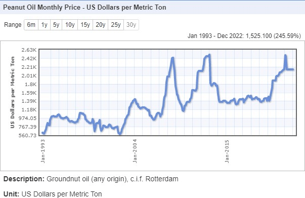 Demand for key peanut products has also shown a healthy overall trend of growth, with similar shock price rises in 2008 and 2012, but later recovering to a more nominal rate of growth. By the end of 2022, the baseline price for peanut oil on the Rotterdam exchange was $2,150 per metric ton.