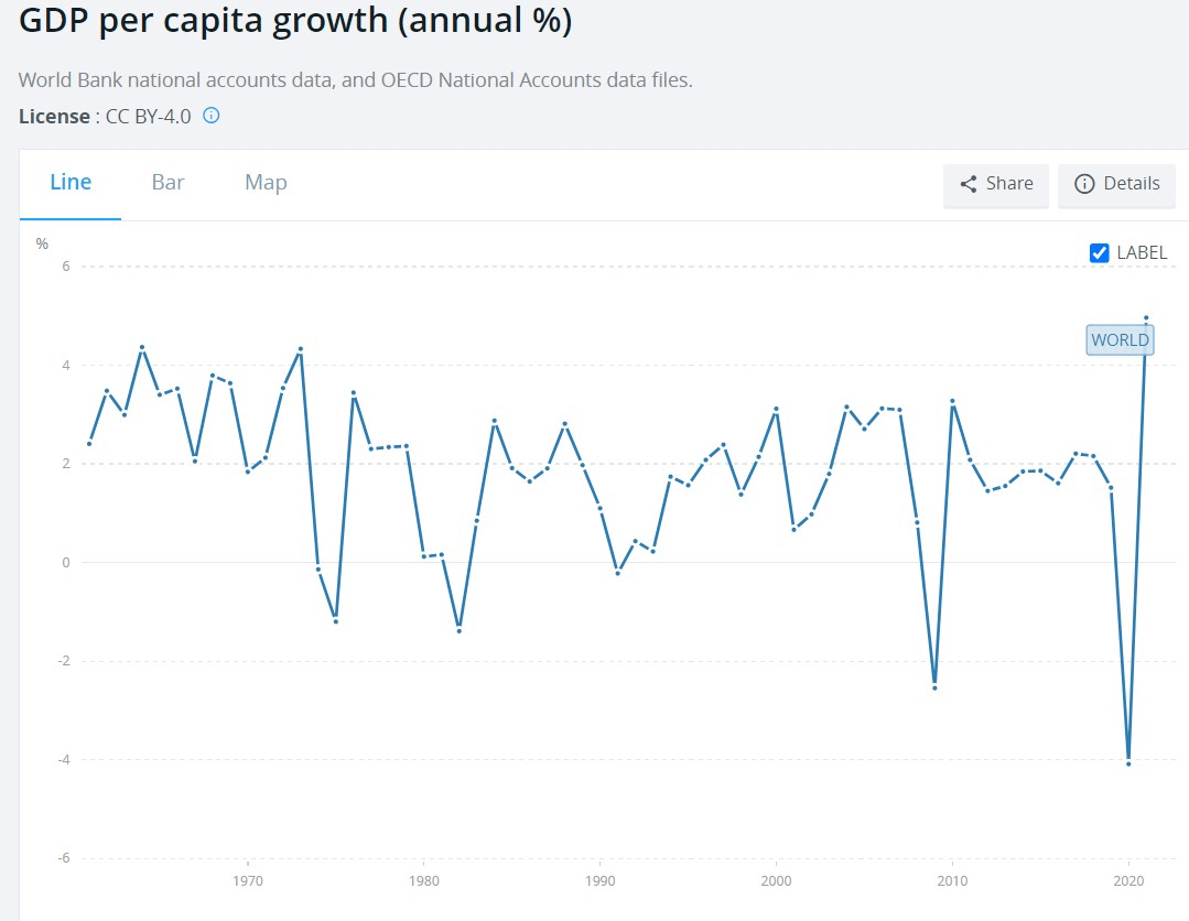 Gross domestic product per capita growth has proved far more volatile than inflation over the past 40 years. The World Bank reports a -2.5% hit during 2009 as the world recovered from the economic crash, offset by income growth around and above 3% in numerous subsequent years, when anomalies driven by the COVID-19 pandemic are excluded.