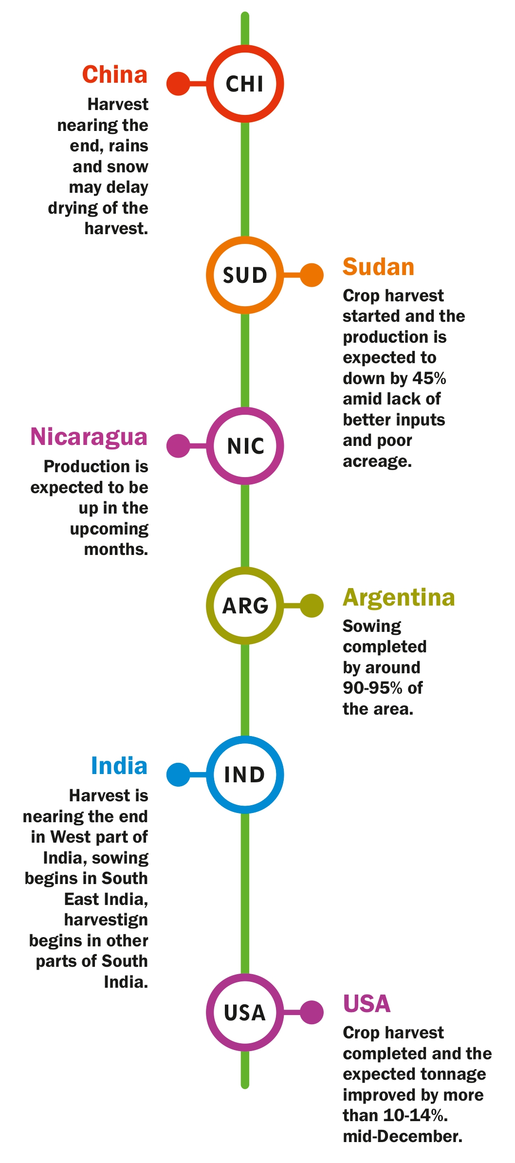 SOUTHERN REGION:Karnataka faces internal supply shortages, sourcing from Andhra Pradesh and Telangana. Telangana's new crop caters to local demand and not for export. Due to rain, Telangana's sowing is down 25-30%, but yield looks promising. TamilNadu sees a significant surge in sowing demand due to favourable November rains. Orissa struggles with sowing, depending on Karnataka and Rajasthan, but lacks the javavariety, relying on Andhra Pradesh and Gujarat.
