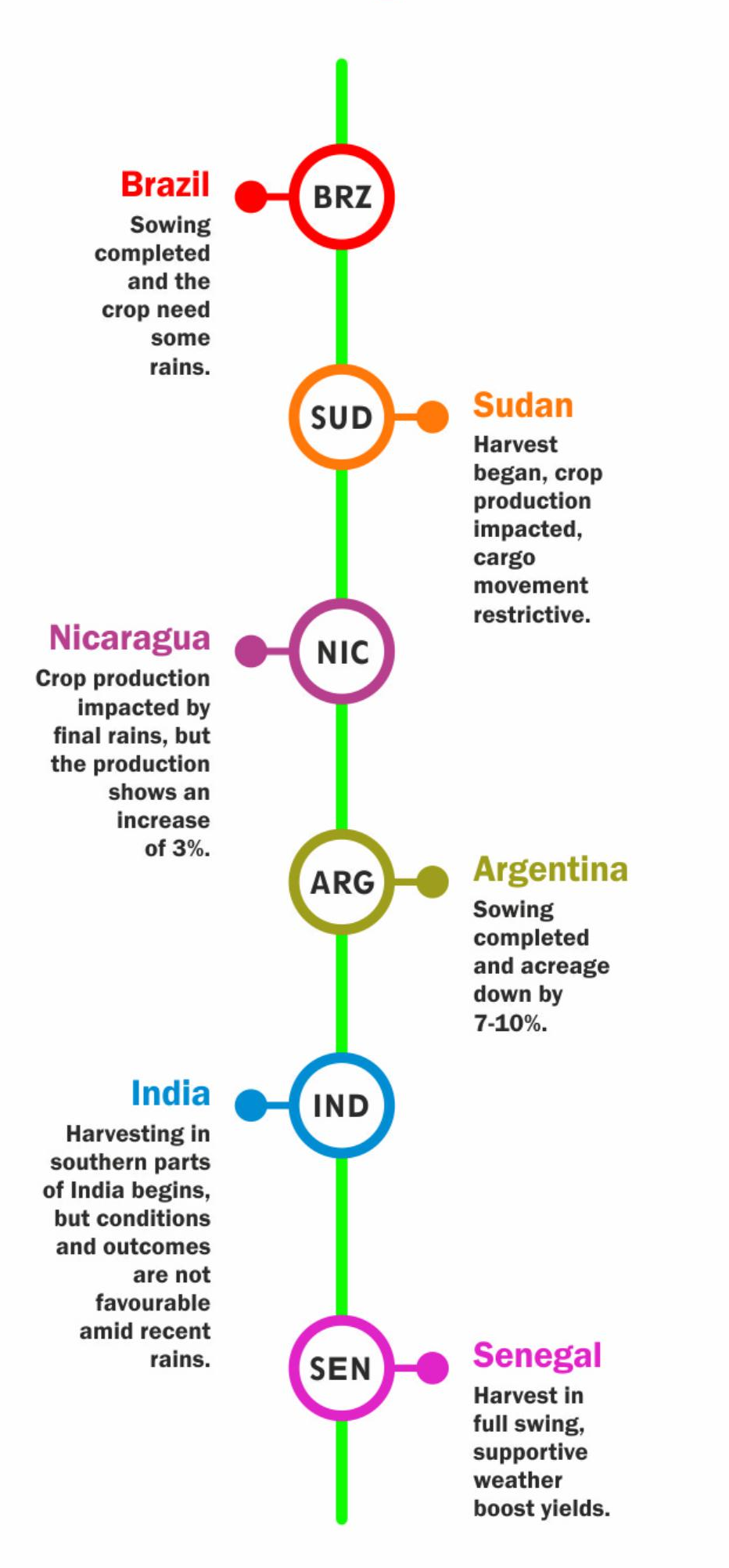 Argentine fields have wrapped up planting, but a 7-10% land decrease looms due to soaring leasing rates and waning farmer interest. Currently, adequate rainfall needs a boost for secure crops, aiming at 120%+ productivity. Cargo strain heightens with lower shipments, stabilizing Rotterdam prices at $2200 but with reduced quality. The new government's Ieap from 5% to 15% in peanut export taxes worries exporters seeking representation for rate relief. Amid challenges, rain holds potential as Argentina's peanut crop saviour, while rising freight costs challenge new contracts' profitability.