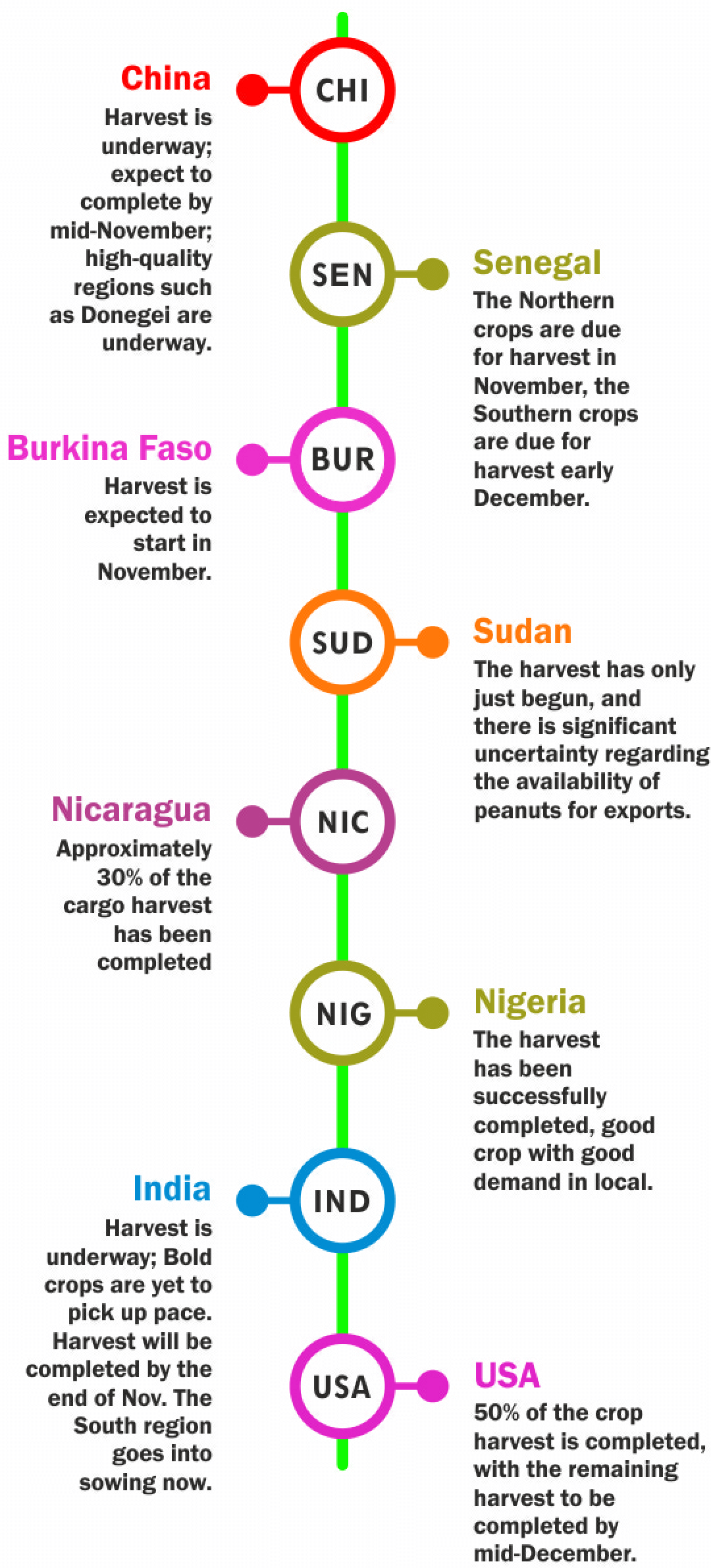 The new crop is ready for harvest; export prices will be set by early December. Despite remaining old crop stocks with uncertain quality, limited Chinese presence in Senegal may pose export challenges this year.